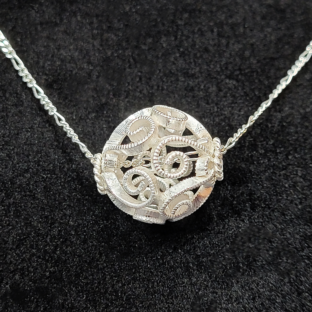 Filigraantehnikas krõll on korraga tugev ja õrn: selle sees peegeldub valgus, liikudes läbi väikeste avade ja pitsilise punutise. Tulemuseks on ehe, mis ei ole lihtsalt ripats, vaid väike skulptuur kaelas — elav, rütmiline ja elegantne. Krõll on kinnitatud ilusale hõbeketile, mis toetab kompositsiooni, kuid ei tõmba tähelepanu endale.