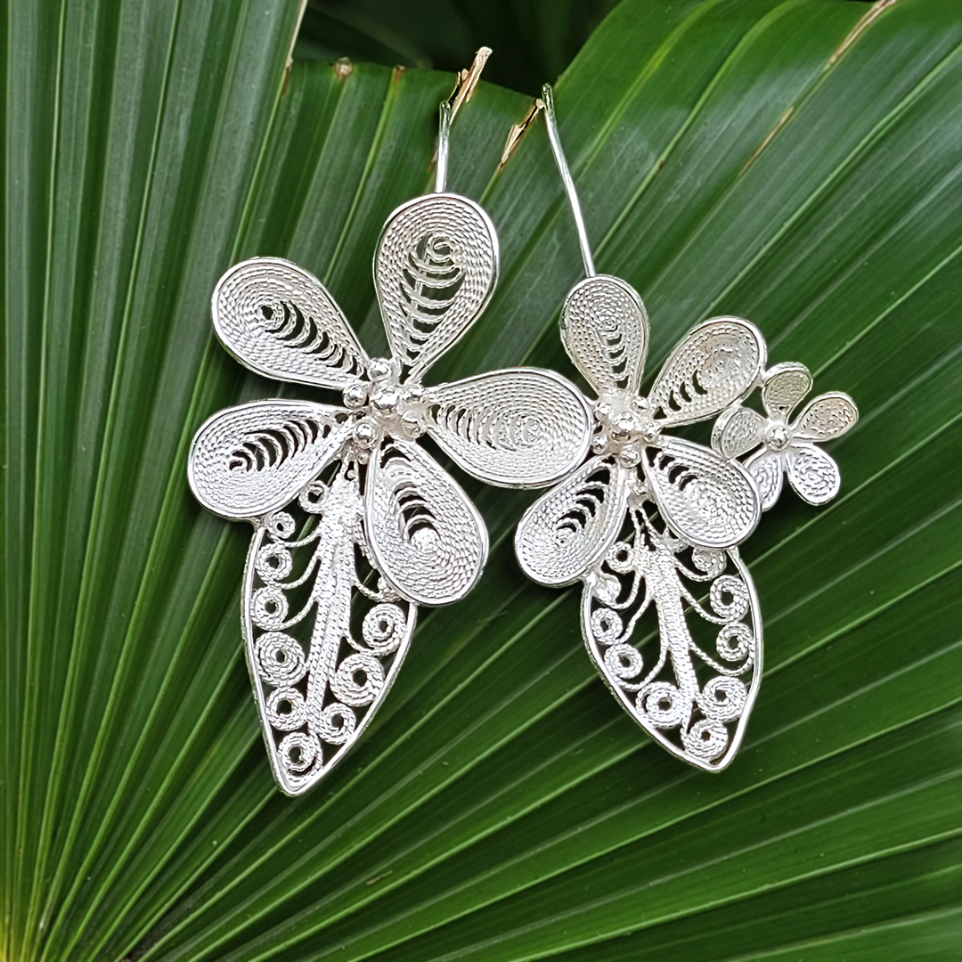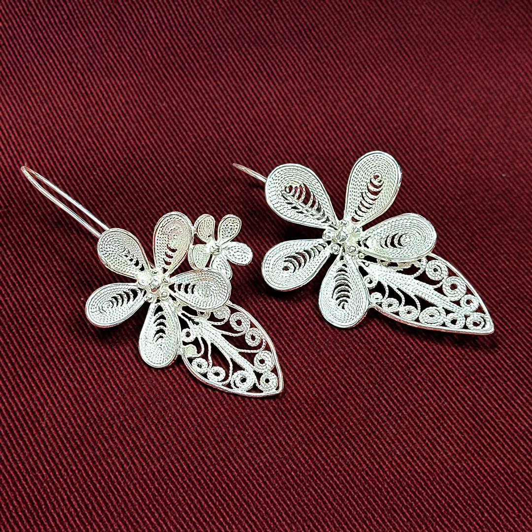 Asümmeetriline lillemotiiv annab ehtele mängulisust ja kaasaegset elegantsi, samal ajal kui peen spiraal- ja kaarmuster hoiab kinni filigraanikunsti ajatusest. Valgus libiseb läbi kroonlehtede ja keerude, muutes kõrvarõngad kord pilkupüüdvaks, kord õrnaks.