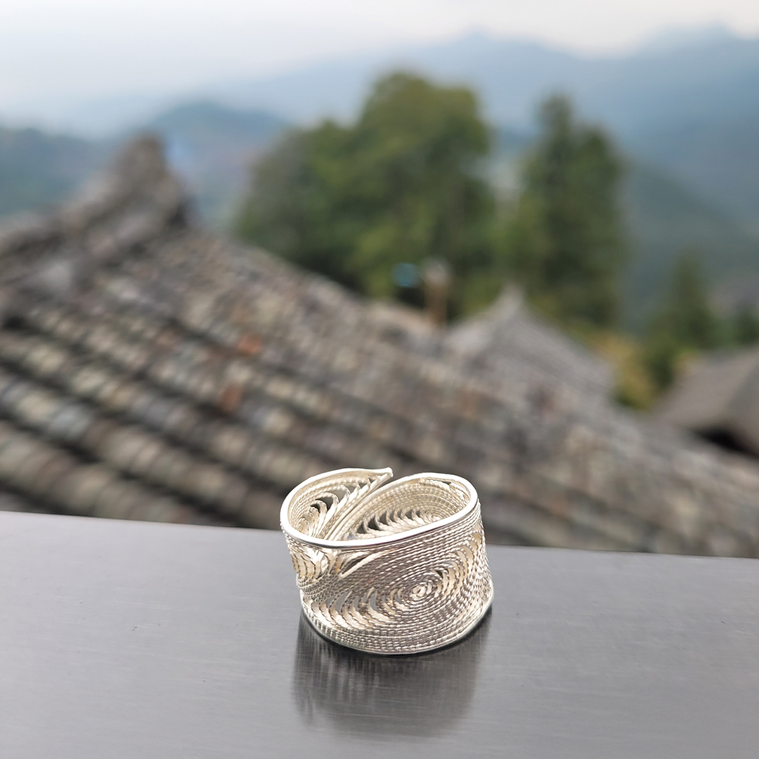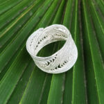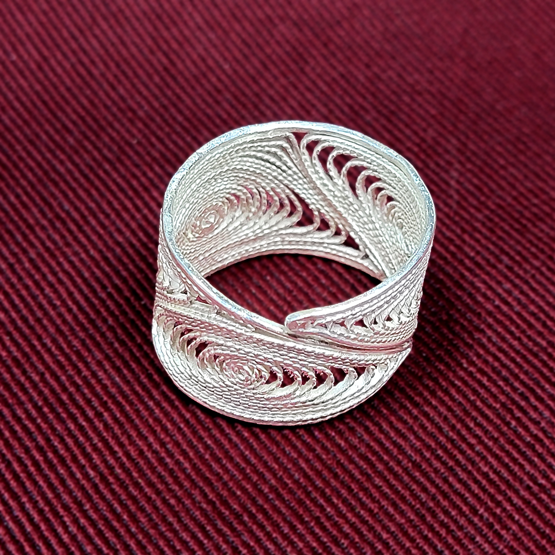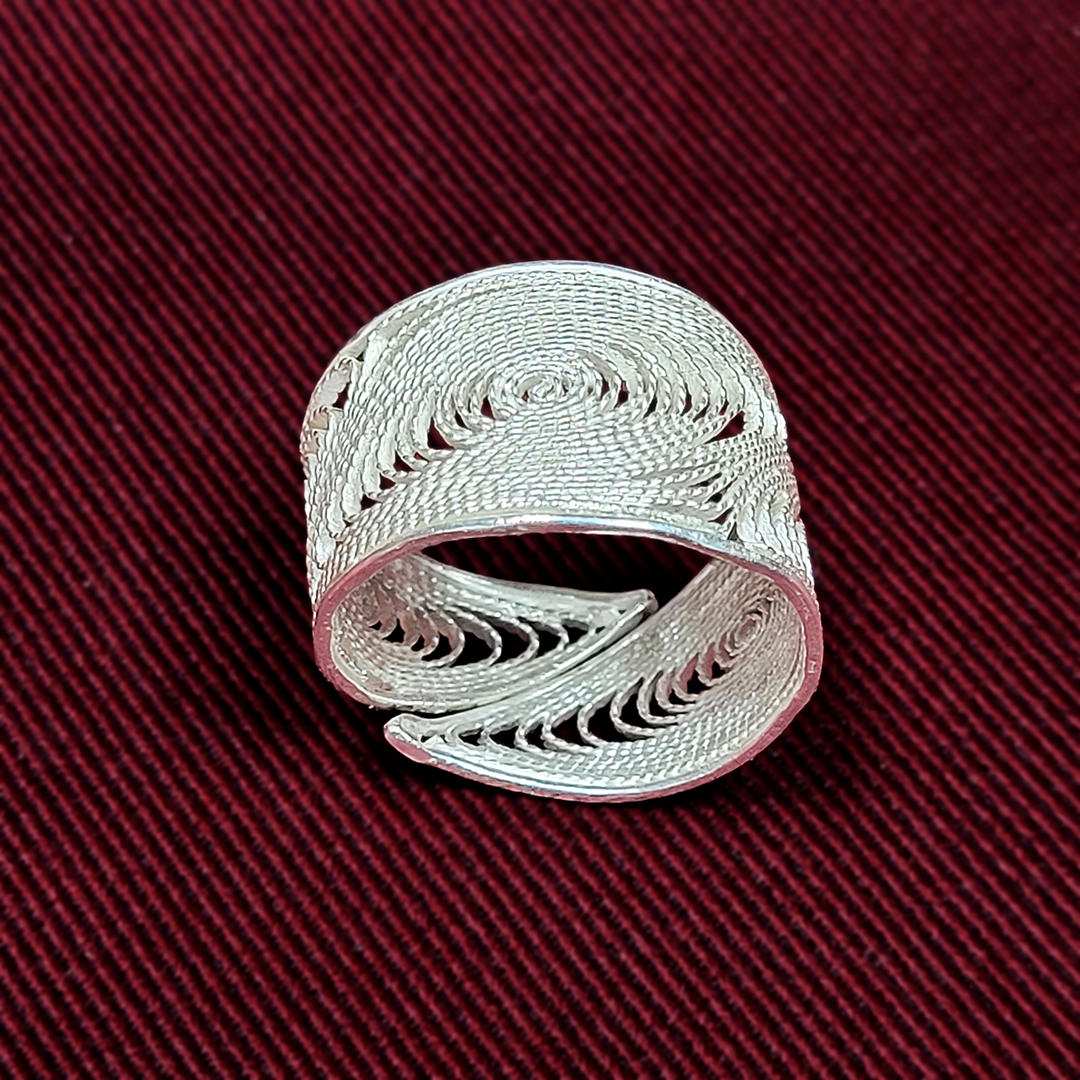 See reguleeritav sõrmus on ehe näide sellest, kuidas 999 hõbe võimaldab filigraanis midagi sellist, mida tavaline 925 hõbe ei võimalda. Peaaegu puhas hõbe on erakordselt plastiline, mis lubab traadil kujundada väriseva joone asemel sujuva, voolava mustri. Nii sünnib sõrmus, mille pind on ühtlane, kerge ja peenelt liikuv.