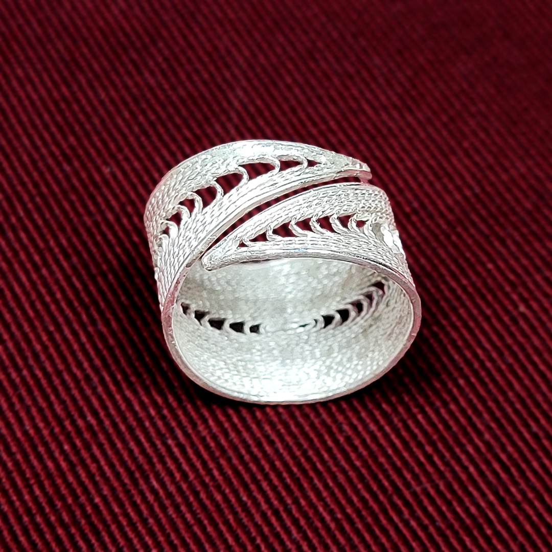 See reguleeritav sõrmus on ehe näide sellest, kuidas 999 hõbe võimaldab filigraanis midagi sellist, mida tavaline 925 hõbe ei võimalda. Peaaegu puhas hõbe on erakordselt plastiline, mis lubab traadil kujundada väriseva joone asemel sujuva, voolava mustri. Nii sünnib sõrmus, mille pind on ühtlane, kerge ja peenelt liikuv.