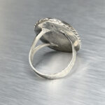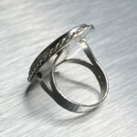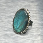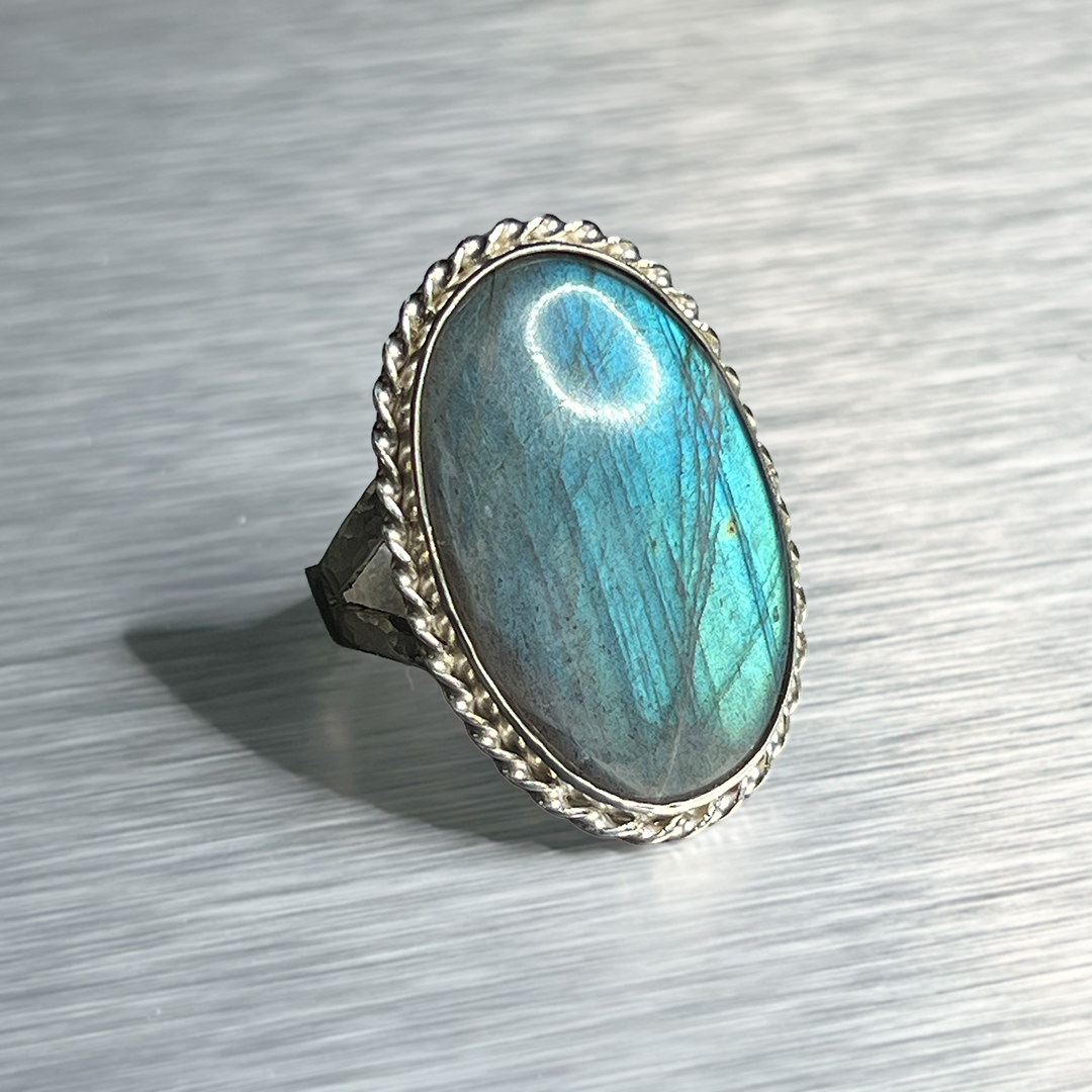 Sõrmus, mis kannab endas meresügavuse vaikust ja valguse muutlikku hingamist. Suur ovaalne labradoriit avab end murtud toonides – hallikasrohelistes ja meresinistes varjundites, mille vahele jääb hetkiti õrn hõbedane helk. Kivi elab valgusega, peegeldades seda kord sügavalt, kord õhkõrnalt – nagu vesi tuule käes.