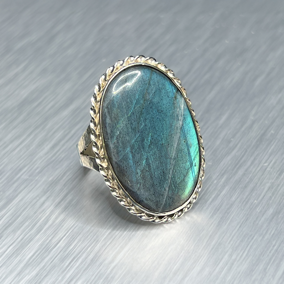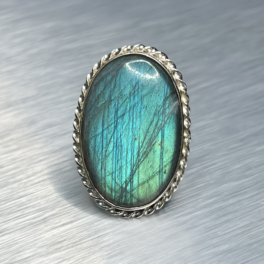 Sõrmus, mis kannab endas meresügavuse vaikust ja valguse muutlikku hingamist. Suur ovaalne labradoriit avab end murtud toonides – hallikasrohelistes ja meresinistes varjundites, mille vahele jääb hetkiti õrn hõbedane helk. Kivi elab valgusega, peegeldades seda kord sügavalt, kord õhkõrnalt – nagu vesi tuule käes.