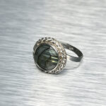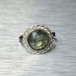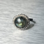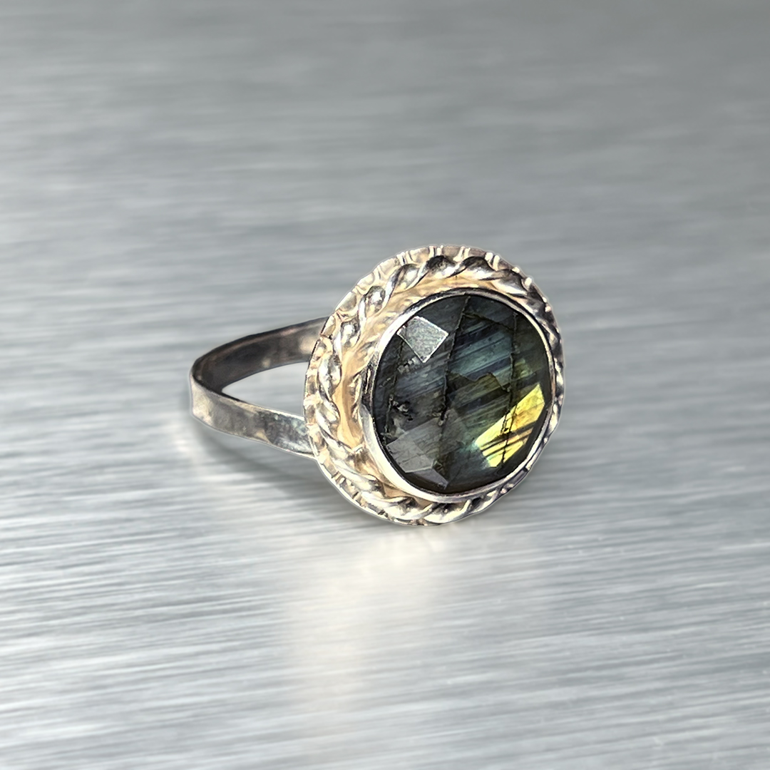 Väike, kuid mõjuv sõrmus, mis kannab endas valguse ja varju tasakaalu. Fassetitud labradoriit avab end sinakasrohelistes toonides, ent ühe nurga alt süttib ootamatult kuldkollane sähvatus – justkui viimane päikesekiir enne loojangut.