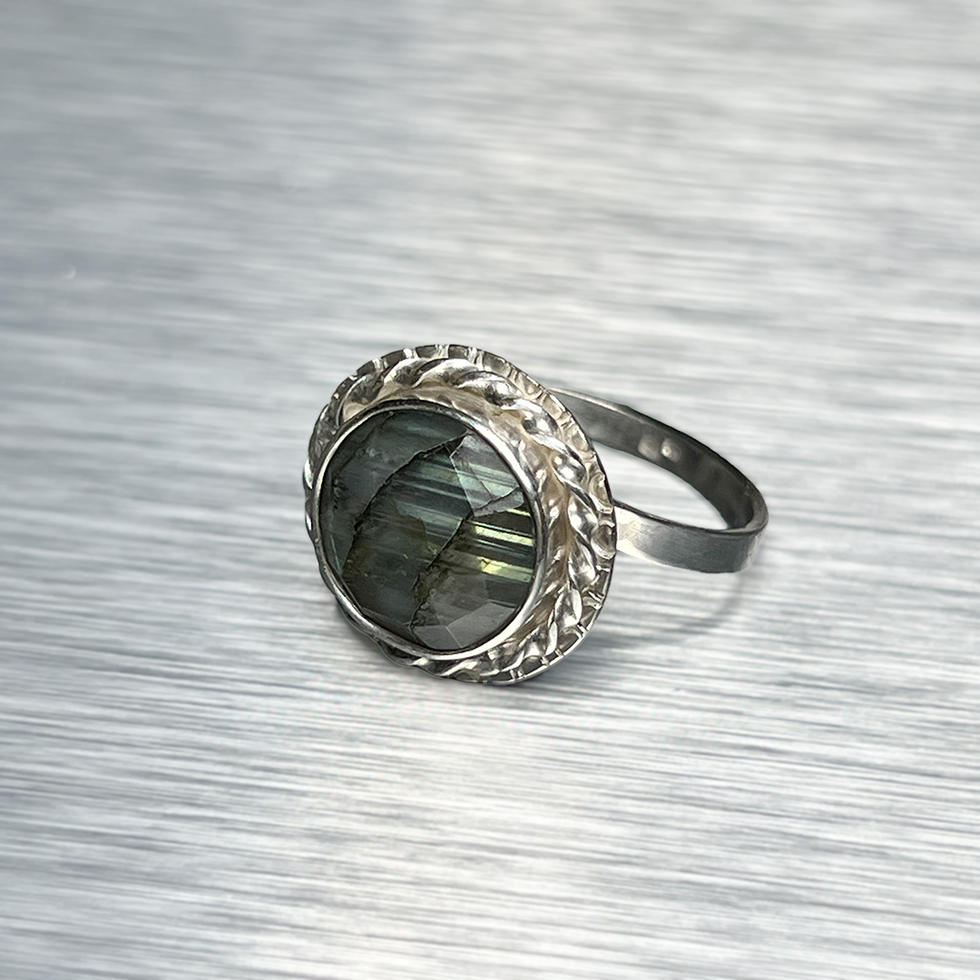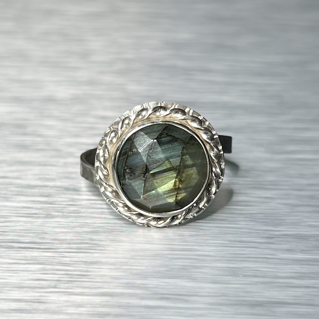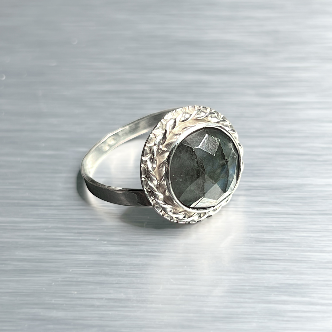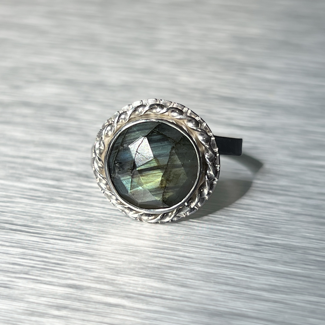 Väike, kuid mõjuv sõrmus, mis kannab endas valguse ja varju tasakaalu. Fassetitud labradoriit avab end sinakasrohelistes toonides, ent ühe nurga alt süttib ootamatult kuldkollane sähvatus – justkui viimane päikesekiir enne loojangut.