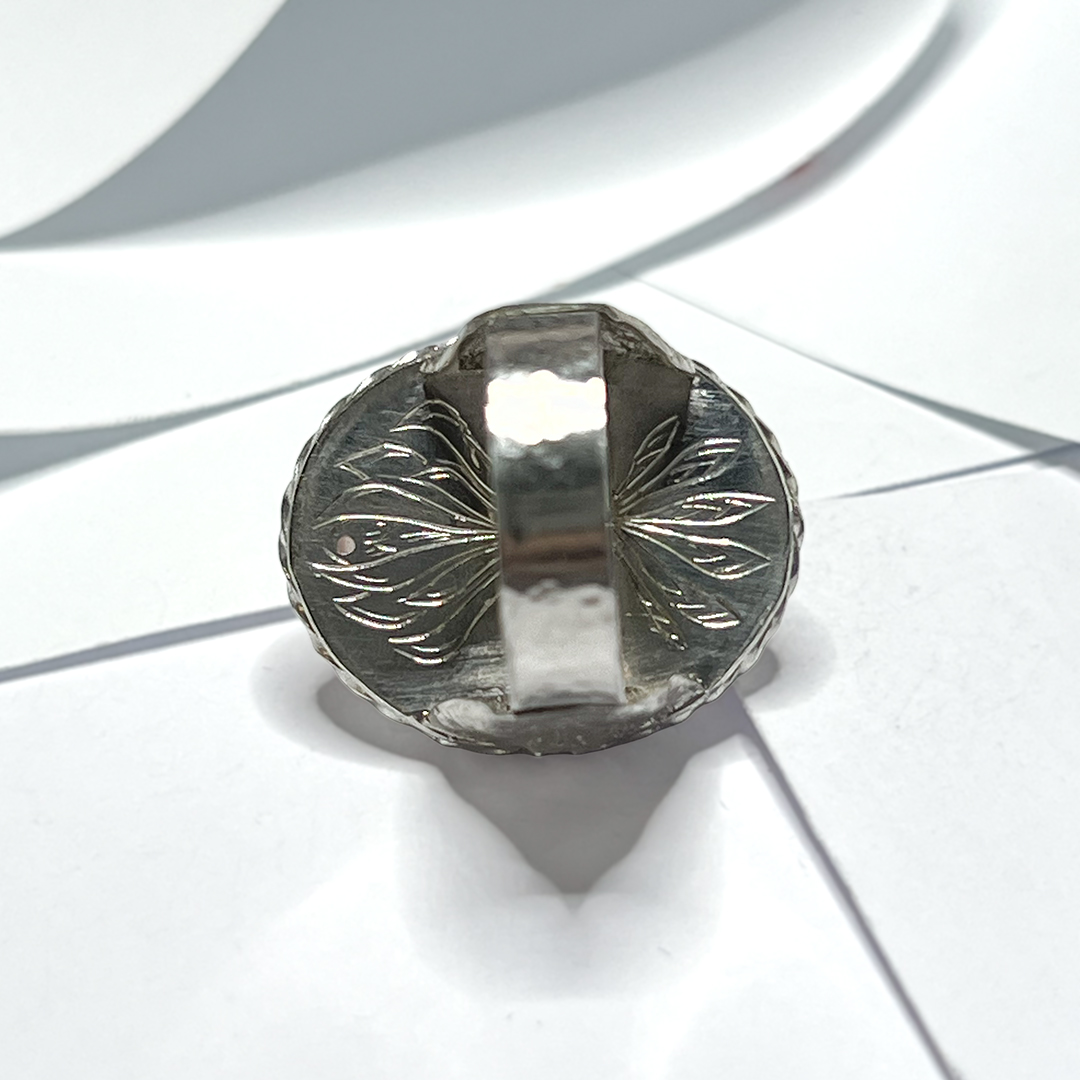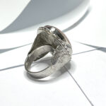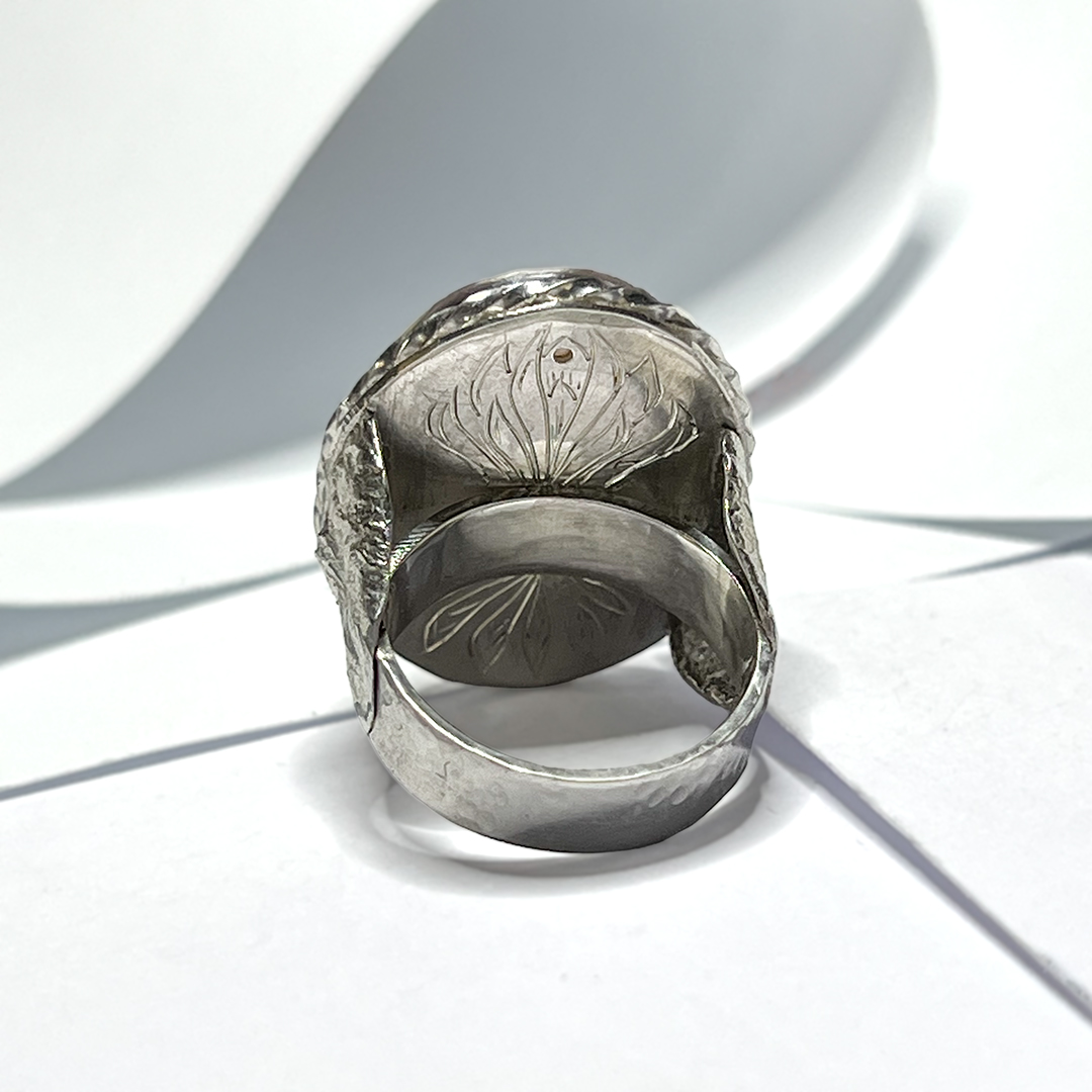 Rõngas on lihtsa vormiga, andes fookuse kivile ja tekstuursele külgviimistlusele. See ehe ei trügi esiplaanile, kuid tõmbab pilku oma peene tasakaalu, sügava naiselikkuse ja elegantse enesekindlusega.
